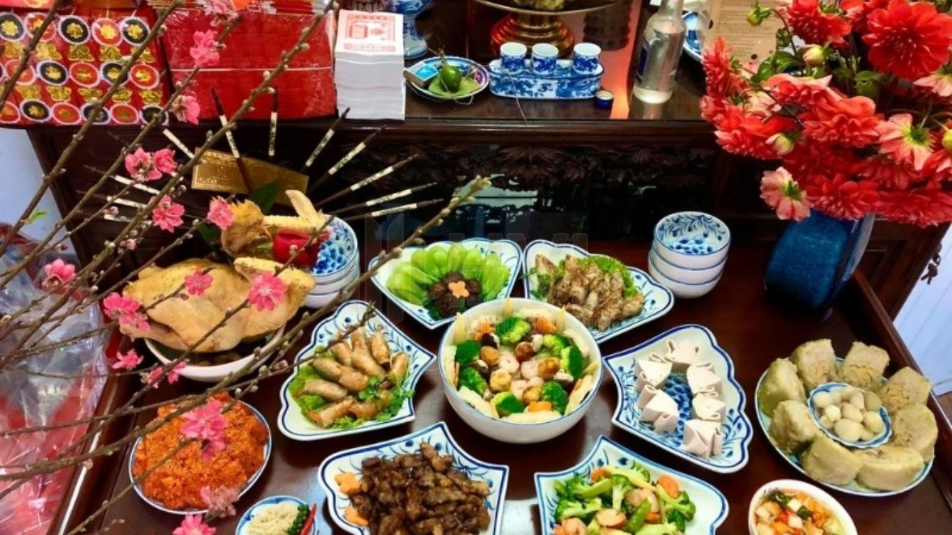 - Món ăn truyền thống: Gà luộc, xôi, bánh chưng, giò lụa, canh măng, thịt đông.