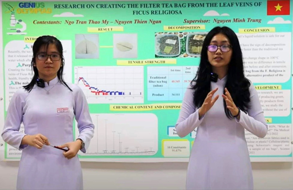 Túi lọc trà truyền thống đã trở thành một phần không thể thiếu trong thói quen thưởng trà của nhiều người. Tuy nhiên, theo nghiên cứu khoa học, những chiếc túi lọc trà thông thường chứa vi nhựa có thể ảnh hưởng trực tiếp đến sức khỏe người dùng, đồng thời chúng mất hàng trăm năm để phân hủy trong môi trường. Nhận thấy vấn đề này, hai bạn trẻ Ngô Trần Thảo My và Nguyễn Thiên Ngân, học sinh lớp 11 Trường THPT Gia Định, đã nghiên cứu và cho ra đời một sản phẩm độc đáo: túi lọc trà bằng lá cây.
